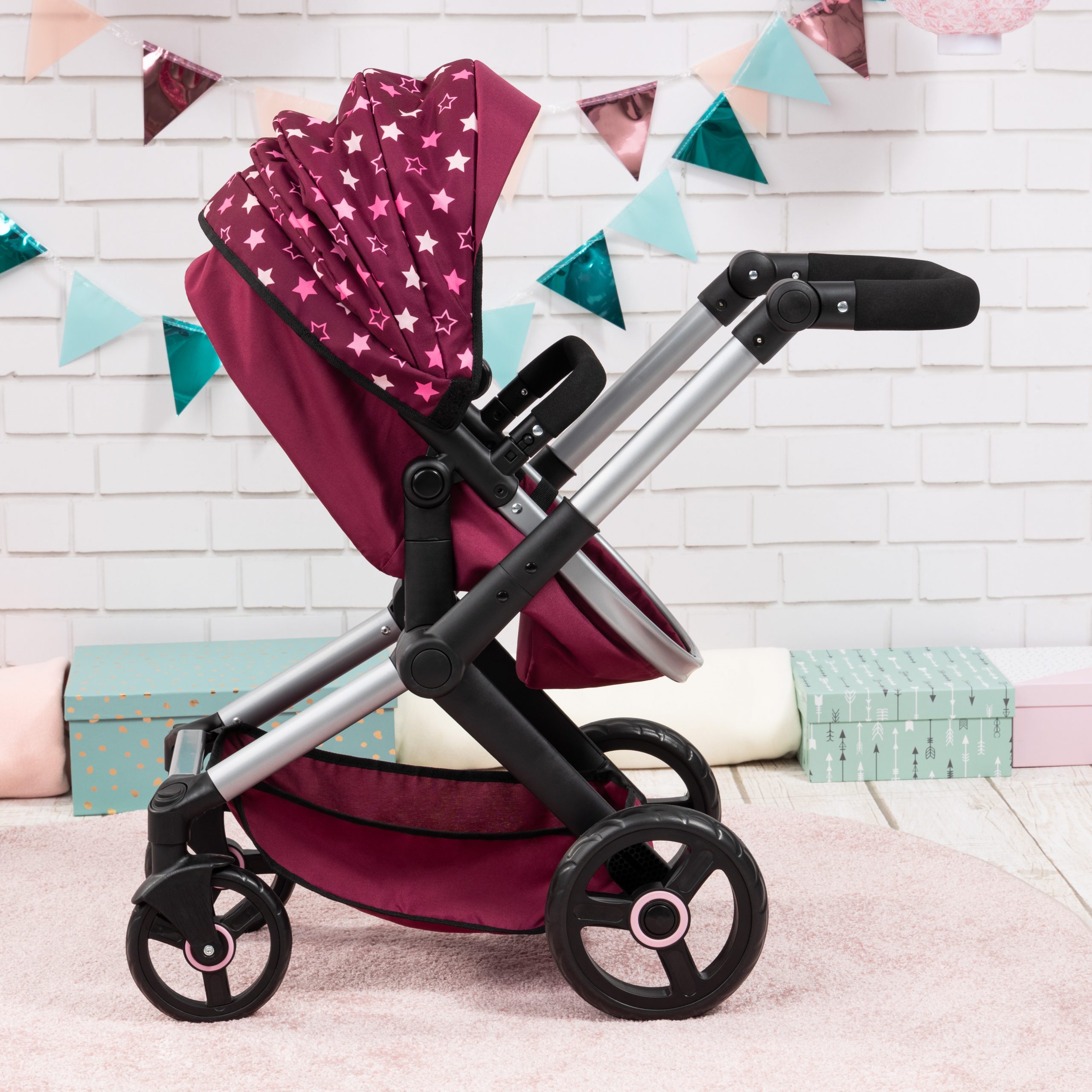 Muñecas de diseño BAYER: carriola XEO – BURGANDY, estrellas blancas, unicornio: el carriola de muñeca combinado XEO tiene un moderno diseño de estrellas burdeos y blancas y es adecuado para muñecas de hasta 46 cm. Con su mango ajustable, el carriola XEO se adapta sin esfuerzo a la altura de tu hijo, proporcionando comodidad y comodidad durante el juego. Lo que distingue a este carriola es su versatilidad; el capazo se puede montar en la dirección del viaje o hacia tu hijo, ofreciendo flexibilidad para adaptarse a varios escenarios de juego. Además, con el mango reversible, la transición entre direcciones es muy fácil. Transformar el carriola XEO en un carriola es una tarea sencilla, gracias a los botones de presión y el ángulo ajustable del capazo. La funda de capazo puede ir de cualquier manera, por lo que si tu muñeca está sentada o acostada, la funda de capazo protege del sol y el viento. La maniobrabilidad es clave, y el carriola XEO sobresale por sus ruedas delanteras giratorias, lo que garantiza un giro estable y una navegación fluida. La bolsa de acompañamiento añade funcionalidad, con un asa larga para su uso como bolsa de hombro y dos asas cortas para llevar a mano, junto con un cierre de cierre seguro para tranquilidad. Para más espacio de almacenamiento, la cesta de la compra integrada también es perfecta para mantener todo almacenado. Con el carriola de carriola de Muñeca Combi, la imaginación de tu hijo no conoce límites, ya que se embarcan en infinitos viajes de creatividad y diversión. Incluye: 1 carriola de muñeca Xeo y 1 bolso a juego. Adecuado para niños y niñas a partir de 3 años.