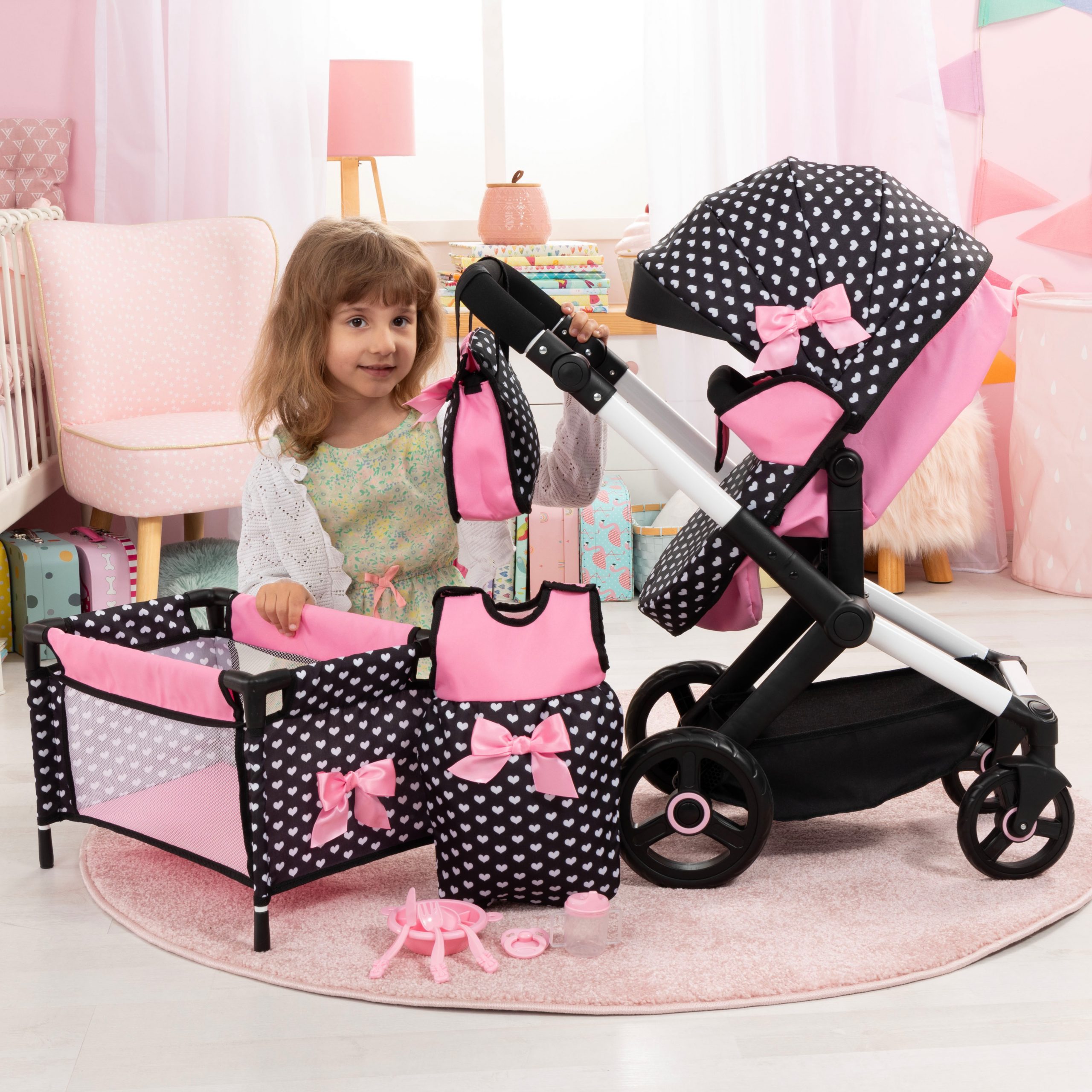 Este gran juego de cochecito para muñecas se compone de un cochecito para muñecas, un bolso, una cama para muñecas, un saco de dormir y accesorios de plástico. El moderno cochecito de muñeca combinado XEO tiene un diseño elegante y muchas funciones diferentes. A él, caben muñecos con un tamaño de hasta 46 cm. Gracias a su manillar con altura regulable, se adapta de forma óptima a la altura correspondiente de cada niño. El cochecito de muñeca también tiene un manillar reversible. El capazo puede ponerse en el sentido de la marcha o de cara al niño. Además, este, mediate unos botones pulsadores, se puede transformar en silita, la cual se puede colocar simelomente en ambos sentidos.